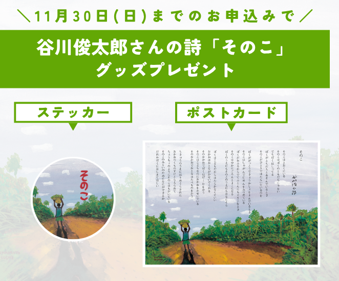 11月中にお申込みいただいた方には、谷川俊太郎さんの詩「そのこ」のポストカードと、絵本のイラストを使用したステッカーをプレゼントします。