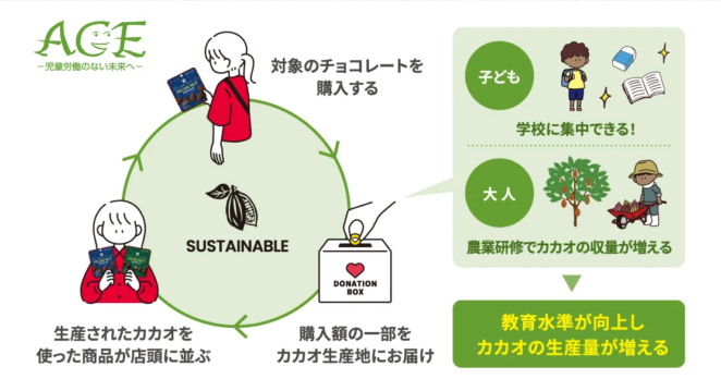 セブン‐イレブン等で販売される「セブンプレミアム」シリーズの一部商品には、購入金額の一部がACEを通じて、ガーナのカカオ生産地域を支援する活動に寄付される仕組みが導入されています。