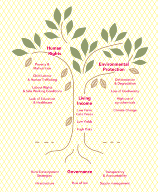 カカオ産業の三大課題と言われる人権課題、環境課題、生活所得(生産者の低収入)は、それぞれの課題を生み出す個別の要因が存在するのではなく、たくさんの要素が3つの課題にまたがり相互に複雑に絡み合っています。