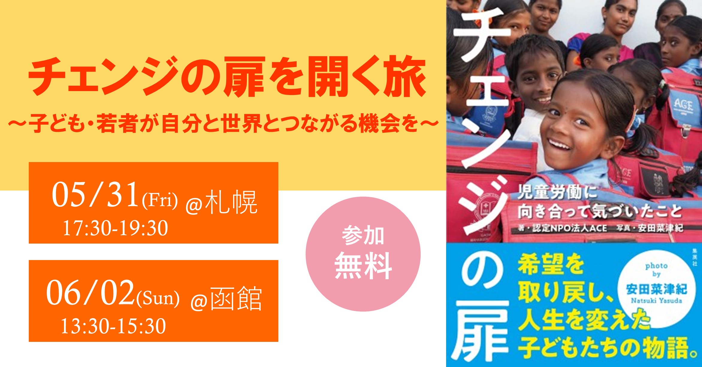 2018年にACEが出版した「チェンジの扉~児童労働に向き合って気づいたこと~」に関連したイベントを、札幌と函館で行います! ACEの活動を通じて教育を受けられるようになった子どもたち、コミュニティを変革したおとななど、出会った途上国の人々から見えてくるのは、「人生は選択でき、変えることができる」ということ。そして、変えるきっかけは誰にでもあるということ。 途上国の人たちと日本の私たちが、お互いに人生の目的を探すヒントをもらい合い、 たくさんの「チェンジ」がつながることで、社会や世界はより良い方向に向かうのでは…そんな思いをもって活動しています。 イベントでは、フォトジャーナリストの安田菜津紀さんが撮影し、本にも収録されている写真を紹介しながら、ACEが出会ってきた子どもや家族、コミュニティの様子をお伝えします。またACEのスピーカー2人の変化のストーリーや本の制作秘話などもお話し、参加者のみなさんとの対話の時間を持ちたいと思います。 こんな方におススメです!