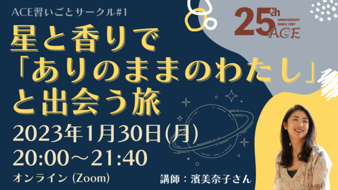 「習いごと」を楽しみながらACEの活動や児童労働・子どもの権利を学べる「ACE習いごとサークル」が、2023年スタートします! なにか新しいことを始めてみたい 、ACEや児童労働に関心があるけど知識が全くないから参加していいか迷う、身近な人にも子どもの権利や課題を広めたいけどカタいイベントだと誘いにくい…などと感じているみなさまに、気軽に楽しみながらACEのことを知っていただいたり支援いただける場を作ってみました。 今後、ゲストでお呼びする講師のみなさまにご協力いただきながら、不定期の連続イベントとして様々な企画を行っていきます。 記念すべき第1回は、アロマセラピスト等として活動する濱 美奈子さんを講師としてお招きします。占星術とアロマテラピーを組み合わせて、「わたしらしさ」に出会い癒される時間を一緒に体感しませんか? 自己定義や外側にあるレッテルをはずし、その人自身のありのままの個性に光をあてることで、新しい年を自分らしくスタートさせるヒントを教わりたいと思います。 それぞれが選んだ自分を解放する香りや個性を高める香りを濱さんに調合していただき、後日ミストを発送します。「ありのままのわたし」を引き出してくれる香りに包まれて、2023年を一緒にスタートさせましょう! ACEのパーパスは「子ども、若者が自らの意志で人生や社会を築くことができる世界をつくるために、子ども、若者の権利を奪う社会課題を解決」することですが、子ども・若者だけでなくおとなの方にも自らの意志で人生や社会を築いてほしいと願っています。そのための一歩にこの会をお役立ていただければ幸いです。 ご関心のある方は性別、年齢を問わずどなたでもご参加いただけます。ご参加をお待ちしています! 開催概要