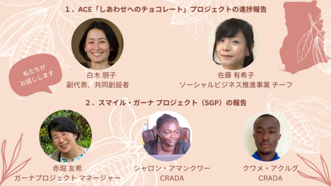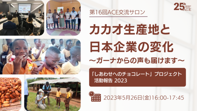 - 第16回ACE交流サロン「カカオ生産地と日本企業の変化~ガーナからの声も届けます~」(「しあわせへのチョコレート」プロジェクト活動報告 2023)