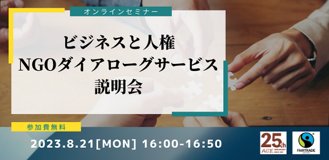 2023年8月、認定NPO法人ACE(エース)と認定NPO 法人フェアトレード・ラベル・ジャパン(FLJ)は共同で、企業の「ビジネスと人権」取り組みの効果拡大をめざし、「ビジネスと人権NGOダイアローグサービス」の提供を開始します。サービス提供に先立ち、8月21日(月)16:00より、オンラインでサービス説明会を開催します。 国連ビジネスと人権に関する指導原則に基づいて策定された「ビジネスと人権国別行動計画(NAP)」(日本政府、2020年10月)や「責任あるサプライチェーン等における人権尊重のためのガイドライン」(経済産業省、2022年9月。以下ガイドライン)が発行され、日本の企業において「ビジネスと人権」への取り組み必要性がますます高まっています。 国連ビジネスと人権に関する指導原則やガイドラインにおいても、「ステークホルダーエンゲージメント」は、自社事業がステークホルダーにもたらす影響を把握し、潜在リスクの特定から是正措置の検討・対応へのステップとして重要な一要素として位置づけられています。NGOは直接人権課題が発生する現場と繋がりながら、企業を含む多くのステークホルダーと連携し課題解決に努めています。また、脆弱な立場にあるステークホルダーとの直接対話が難しいケースでは、NGOがその代弁者になり得ます。これらの理由から、ステークホルダーの一つであるNGOとのダイアローグのニーズが高まっています。 本ダイアローグサービスでは、現行の取り組みへの評価と改善のための実務的な提言を示すフィードバック型と、「ビジネスと人権」に関する研修実施をメインとする情報提供型の2種類を用意しました。当分野に関する高い知見と企業との幅広い連携実績を有するACEとFLJが、個別企業のビジネスの文脈を理解した建設的かつ実用性の高い議論を通し、人権デュー・デリジェンス取り組みにおけるネクストステップを共に考えます。これまでNGOとの接点がなかった方々にもその機会を提供し、本質的な取り組みについて理解を深めていただくことを狙いとしています。 下記の要領で、当サービスについての説明会を開催します。ビジネスと人権への対応に取り組まれている、もしくは取り組もうとしている、自社の取り組みについて専門家の意見を取り入れたい方など、担当者から経営層の方までを対象にしています。ぜひご参加ください。 プログラム(予定)「ビジネスと人権」の動向概要(10分) ビジネスと人権NGOダイアローグサービス ご紹介(10分) ACE法人会員制度 ご紹介(10分) フェアトレード・ラベル・ジャパン法人寄付パートナー制度 ご紹介(10分) 質疑応答(7分)