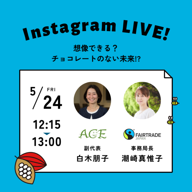 フェアトレード・ラベル・ジャパンとのコラボ・インスタライブ開催のお知らせです! 5月の第2週目の土曜日は世界フェアトレード・デー。5月はフェアトレード月間です。フェアトレードは「児童労働がない世界」を実現する取り組みの1つです。 そこでフェアトレード月間のコラボイベントとして、ACEの副代表 白木とフェアトレード・ラベル・ジャパンの事務局長 潮崎さんとの 5月24日(金)ランチタイムにインスタライブトークイベントを行います!ぜひご参加ください! 開催日:2024年5月24日(金)12:15~13:00 配信方法:インスタライブ(フェアトレード・ラベル・ジャパンとACEのインスタグラムアカウントをフォローして開始時間をお待ちください) 登壇者: ACEのインスタはこちら:https://www.instagram.com/npo_ace_japan/