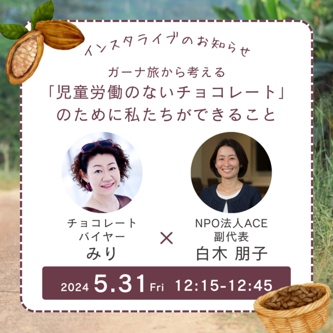 フェリシモのチョコレートバイヤーみりさんと、ACE副代表 白木とのインスタライブが決定! 今年3月、ACEのプロジェクト地であるガーナのカカオ生産地を巡る「スタディツアー」にチョコレートバイヤーみりさんも参加されました。 カカオ農家や子どもたちに会い、サステナブルなカカオの取り組みについて、見て、知って、感じたこととは? ガーナ旅でのエピソードを中心に、フェリシモ「幸福のチョコレート©」に込める想いや、児童労働をなくすためのACEの活動についてお話しします。最後にはACEが挑戦中のクラウドファンディングのご紹介も! 作る人も食べる人もしあわせになれる「児童労働のないチョコレート」があたりまえになるために私たちができることについて、みなさんと一緒に考える時間になればと思います。 ぜひ、チョコレートバイヤーみりさんとACEのインスタアカウントをフォローして当日をお待ちください。 開催日:2024年5月31日(金)12:15~12:45 フェリシモ「幸福のチョコレート©」とチョコレートバイヤーみりさんについて株式会社フェリシモが展開する「幸福(しあわせ)のチョコレート©」のすべての商品には、LOVE&THANKS基金がついています。商品売り上げの1%がACEへのご支援になり、ガーナのカカオ生産地の子どもたちを児童労働から守り教育につなげるためのACEの活動に役立てられます。 フェリシモのチョコレートバイヤーみりさんは、日本初上陸や日本では知られていない世界のローカルチョコを、フェリシモ「幸福のチョコレート©」で25年以上に渡って紹介してきました。 ACEのインスタはこちら:https://www.instagram.com/npo_ace_japan/