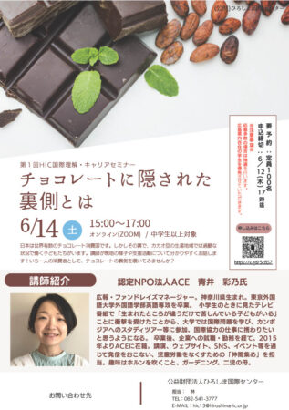 2025年6月14日開催予定の「第1回HIC国際理解・キャリアセミナー(オンライン形式)」に、認定NPO法人ACEの青井彩乃(広報・ファンドレイズマネージャー)が登壇します。 本セミナーは、広島県内の中学生・高校生・大学生をはじめ、国際的なキャリアや社会課題に関心のある方を対象に、国際理解とキャリア形成をテーマに開催されます。 「国際協力に興味がある」「海外で働くにはどんな進路があるの?」「現地の課題って?」そんな問いを持つ方におすすめのセミナーです。 参加無料。事前申込制です。お気軽にご参加ください。 【日時】2025年6月14日(土)15:00~17:00 お申込みはこちら:https://x.gd/5c8S7 |