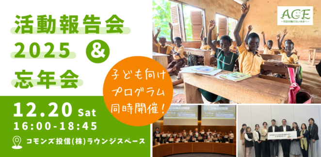 いつもACEの活動を応援いただいている支援者のみなさまへ。 2025年は「児童労働撤廃」の期限年SDGs目標 8.7 で掲げられた「2025年までにすべての児童労働を終わらせる」。 そんな中でもACE は、チョコレート企業、ガーナ政府、国際機関など国内外のさまざまなステークホルダーと連携しながら、活動を加速してきました。 ■報告会の見どころACEの2025年を総括! 代表 岩附より「ACE 5大ニュース」として今年のハイライトを紹介。 3つの活動の報告 ・「しあわせへのチョコレート」(副代表 白木) 創業メンバー+スタッフによるトークセッション 「ACEのこれから(仮)」 子ども向けプログラム 同時開催!会場をお借りするコモンズ投信さんの子ども向けプログラム「こどもトラストセミナー」を同会場内にて開催します。 ・対象:小学生以上 おとなの方は報告会、お子さんはこどもトラストセミナー、その後一緒に忘年会へ、というご参加の仕方もOK! プログラム(予定)報告会(16:00~17:30)16:00 開会 16:05~ 今年のハイライト報告「ACE5大ニュース2025」/ 代表 岩附 16:15~ プロジェクト報告 16:50~ トークセッション「ACEのこれから(仮題)」 17:30 閉会 忘年会(17:45~18:45)軽食・ドリンクをご用意します。スタッフ・支援者同士、ぜひ交流をお楽しみください 子ども向けプログラム こどもトラストセミナー「児童労働って何だろう?」