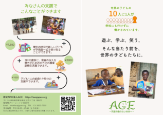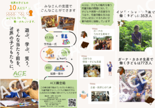 ACEの活動について説明したリーフレットを無料でダウンロードいただけます。ぜひ募金箱と一緒に設置・配布してください。 A4サイズ両面カラー、短辺綴じで印刷いただき、二つ折り(A5サイズ)にしてご使用ください。